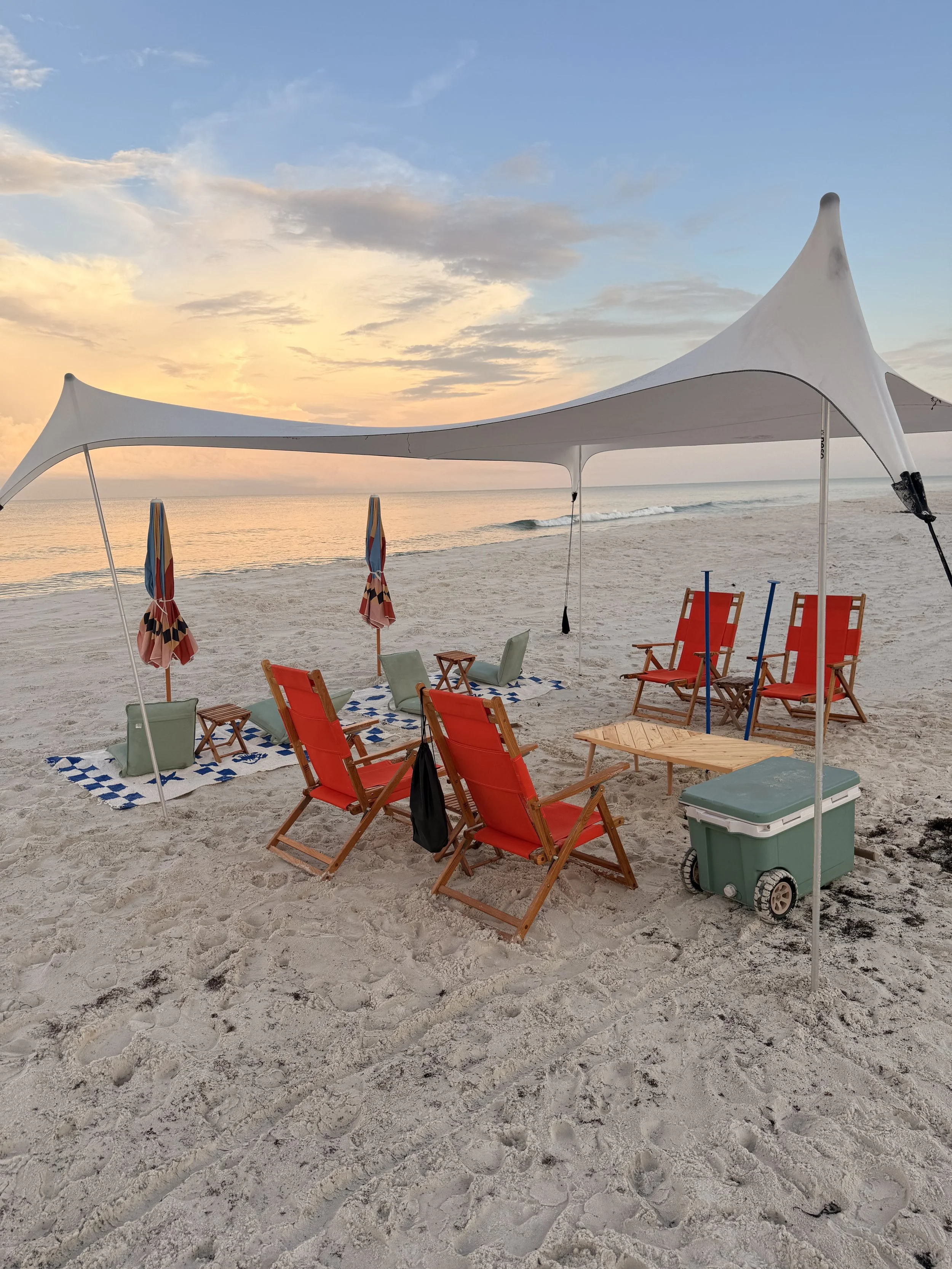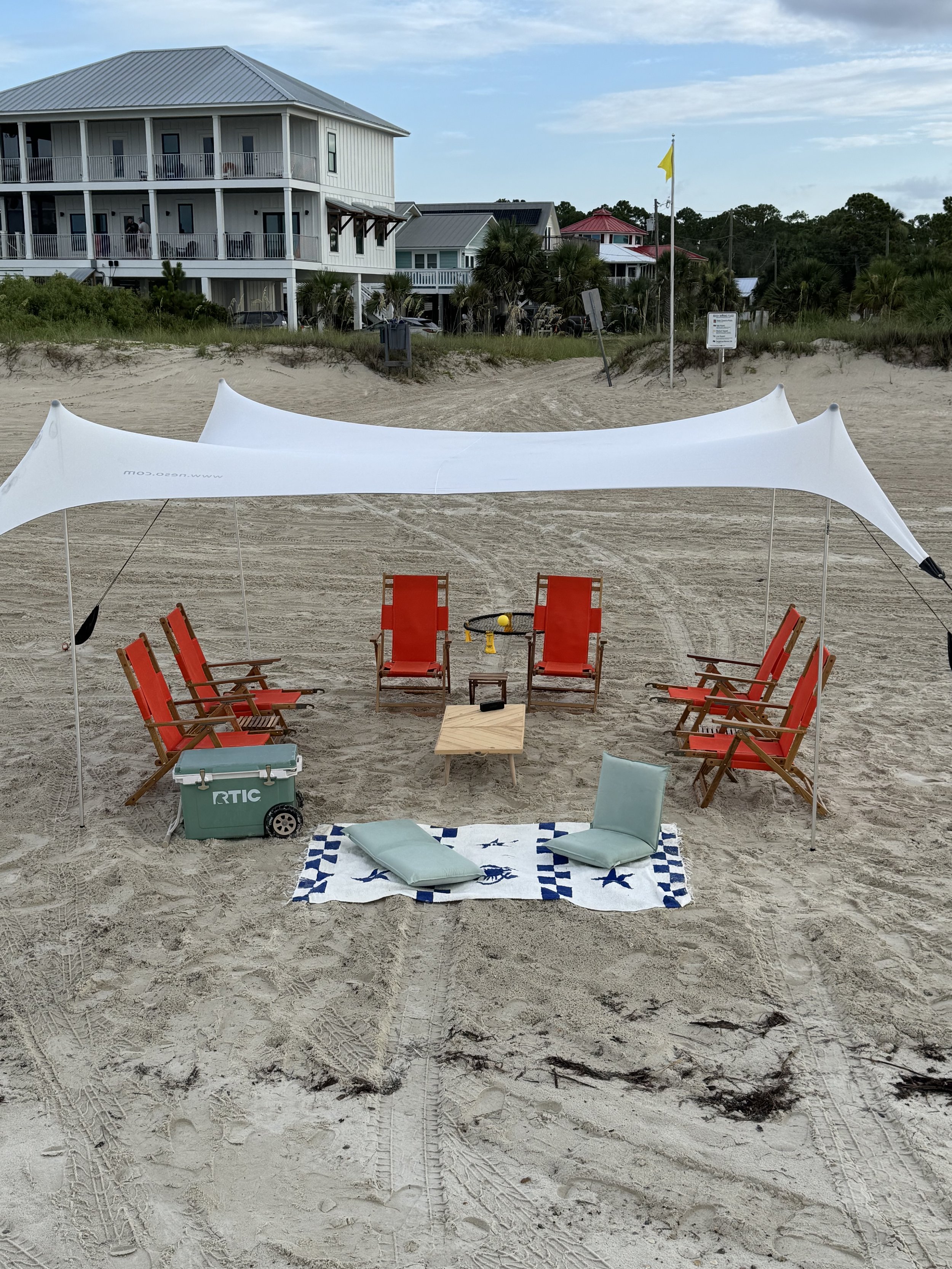 A mix of classic beach chairs and floor seats for groups who enjoy time in and out of the sand
